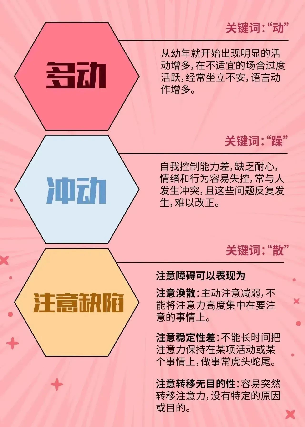 孩子上二年級了,寫作業的效率不高,要喊半天才磨磨嘰嘰挪到桌子旁邊,其他同學半小時能搞定的作業,她要寫上50分鐘,甚至更久。給她說了:作業做完之后,可以做自己想做的事,包括看動畫片、打游戲等;平時也毫不吝嗇對孩子的贊美,但效果卻不大。有時吃完晚飯就開始寫作業,也要耗3、4個小時,寫到深夜才勉強做完,既擔心她身體吃不消,也憂心她學習跟不上。 我兒子從2歲開始就難以控制自己的情緒。一開始,以為是孩子自我意識逐漸形成的叛逆期,也沒有放在心上,覺得過一陣就好起來。但是,隨著年齡的增長,他的情緒問題卻愈加嚴重了。在球場上,他一被斷球就會推人犯規;在教室里,他一做錯題就把試卷揉成一團;回到家里,他稍有不順意就直接用頭去撞地板和墻壁……真的令人非常頭疼。 我去開完家長會后,老師還特意提醒說,孩子在課堂上常常注意力不集中,總是在偷偷摳橡皮、看窗外,剛教的例題,原封不動地搬過來也不會做,希望我在家也能多注意一下。 上面這些孩子他們有什么共性? 他們就只是故意讓父母頭疼? 或者是家長不知怎么管教“熊孩子”? 沒有孩子愿意天生就和父母對著干 他們可能是生病了 對于孩子而言,一兩次難以集中注意力、偶爾管不住自己的脾氣都是正常的。但是,有的孩子長期難以集中注意力、反復與長輩或小伙伴發生沖突,可能從幼年或小學入學開始就持續出現一些癥狀,包括: 當孩子上面這些表現明顯比同齡孩子更明顯時,父母就一定要需要重視起來,因為它們可能預示著孩子患上了注意缺陷多動障礙,也就是家長口中的“多動癥”。 肯定有家長要問「這不就是一般調皮小孩都可能出現的問題,如果說這是一種疾病,那么豈不是很多父母都要帶孩子去干預了?」美國兒科學會和美國疾控中心的《多動癥:父母指南》官方手冊建議,當這些癥狀出現以下影響時,父母就要及時帶孩子去就確診、干預了。 需要注意的是 孩子正處于各類生活、社交、學習技能 建立和發展的關鍵時期 如幼年時出現了這些癥狀卻不加干預的話 可能影響孩子長期的學習、社交能力 甚至影響升學、就業 這些孩子可能到成年以后 依然會被這些問題所困擾 甚至相伴終身